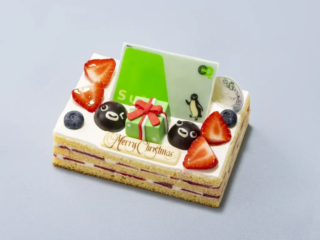 特徴:SuicaのペンギンとSuicaのカード(チョコ)のコンビネーションデコレーション。スポンジはしっとり、内部にたっぷりのいちごを使用。トップにカットいちご、Suicaのカード(チョコ)、プレゼント型砂糖菓子、Suicaのペンギン(顔)チョコを2つトッピング。