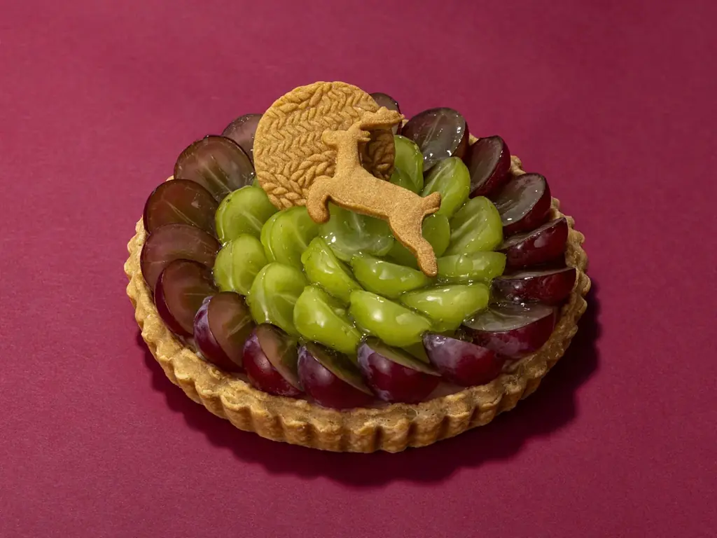 特徴:山形 庄内鶴岡のカラフルぶどう園直送の希少品種〈オリエンタルスター〉とシャインマスカットを贅沢に使用。低温保存で旬を守った希少ブドウをクリスマスまで維持し、ジューシーな果実感を実現。