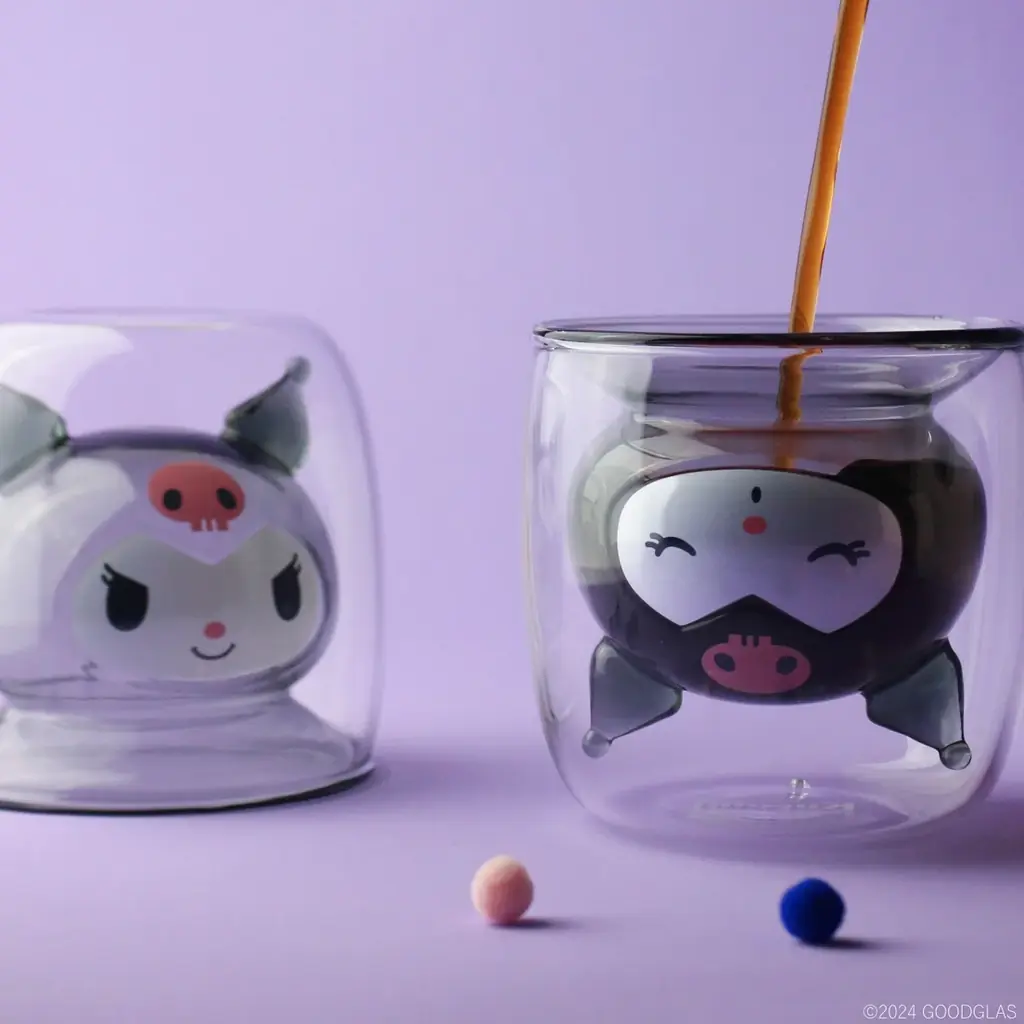 会場には「ハローキティ」「シナモロール」「クロミ」「和服しば犬」などのダブルウォールグラスが並びます。これらはホウケイ酸ガラス製で耐熱温度の幅が広く、温冷両用で使用可能です。