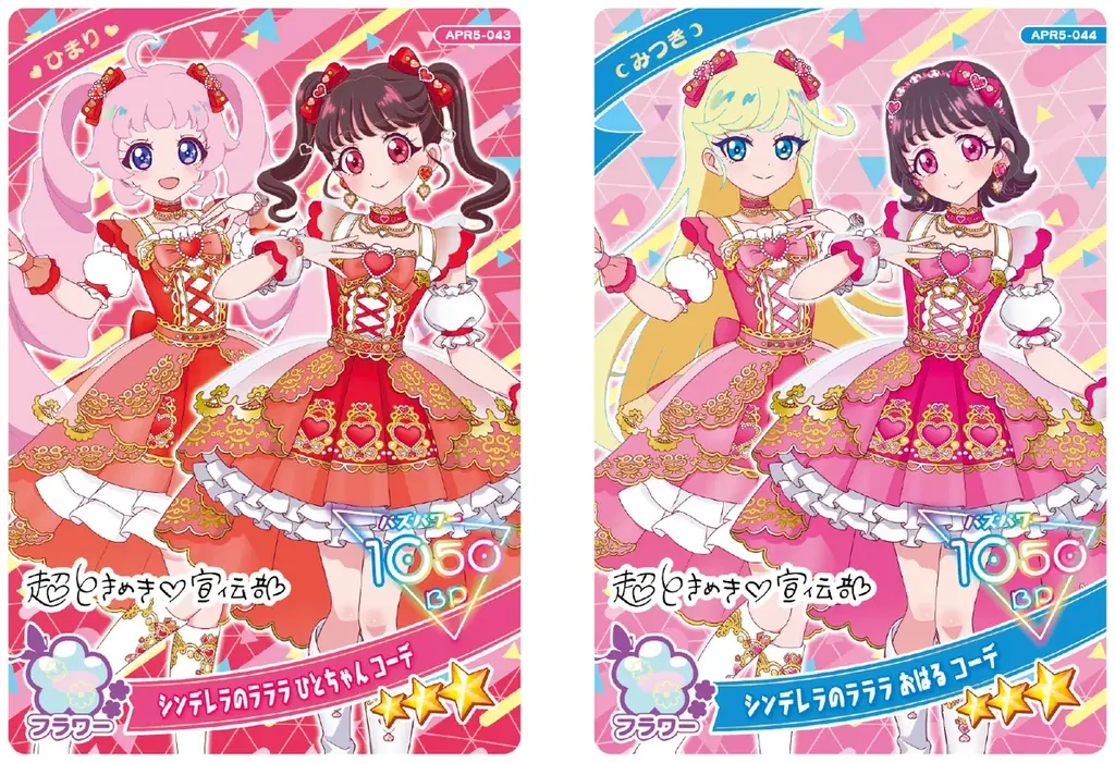 また、音楽ユニット「超ときめき♡宣伝部」とのコラボレーションアイプリカードも登場します。カードは主にテレビアニメ新エンディング主題歌「シンデレラのラララ♡」のコーデを着た坂井仁香・小泉遥香をモチーフにしており、以下の4種類のキャラクターコーデが用意されています。
