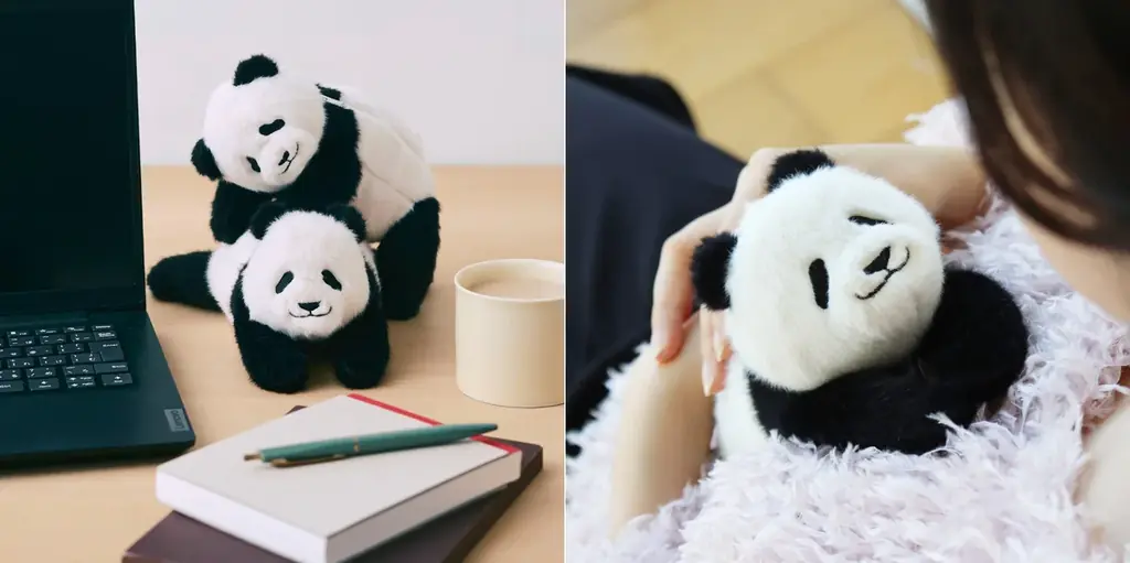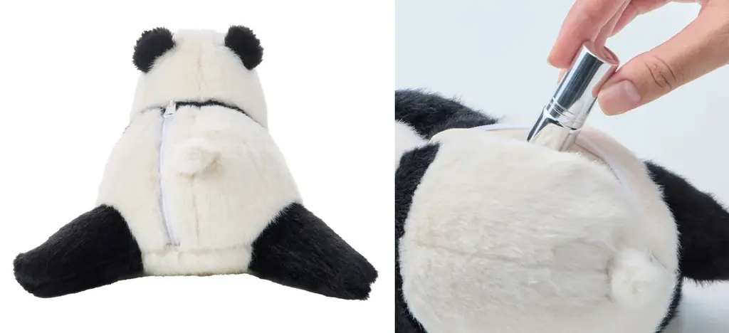 3種類(おてんばシャンシャン/げんきっこシャオシャオ/おっとりレイレイ)。ふわふわの毛並みを再現した素材で、背中のファスナーからリップなど小物を収納可能。デスクに置いても癒やしになるサイズ感。