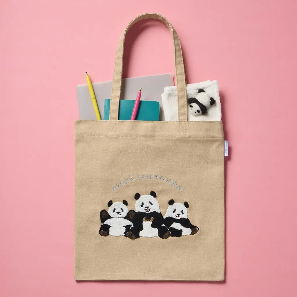 さがら刺しゅうでパンダたちの表情をもこもこと表現したキャンバストート。A4対応で肩掛け可能、デイリー使いに適した丈夫な素材。
