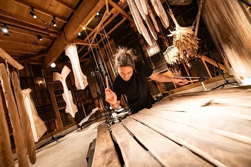 楽器は地元の木材、絹、廃材の鉄など八王子の現地素材を用いて制作されます。絹糸を張った楽器は糸の張力や長さで音程を調整でき、絹布を取り付けた太鼓は打面の素材感が音色に影響します。工場由来の鉄はその質感や共鳴特性を活かして新しい打音や擦り音を生み出します。