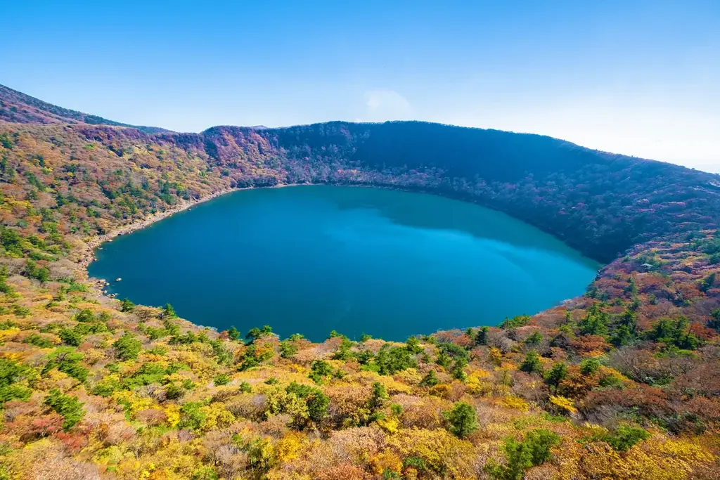 標高1,411mに位置する火口湖で、周囲1.9km・水深11mの湖面を取り囲む紅葉が見どころです。登山口から山頂まで約40分、湖を一周する遊歩道は約1時間30分で回れます。湖面と紅葉のコントラストが特に美しく、比較的容易に登山できるため人気があります。