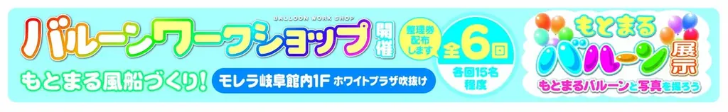 モレラ岐阜館内1Fホワイトプラザ吹抜けでは、バルーンワークショップを開催します。来場者は「もとまる」キャラクターの風船づくりに挑戦でき、出来上がった作品は展示されます(もとまるバルーン展示)。制作体験を通じて親子で楽しめる企画です。