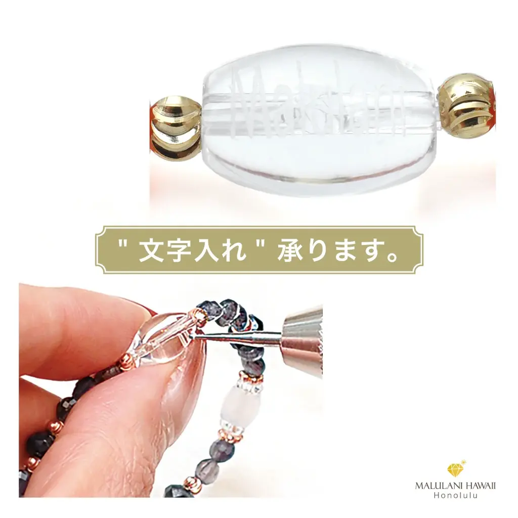 刻印仕様として、水晶チャームに「Malulani(マルラニ)」刻印が施されています。Malulaniはハワイ語で「神に護られた」を意味し、「神のご加護がありますように」という祈りを込めた刻印です。水晶の裏面にはお好みの英数字を6文字まで刻印可能(有料オプション:+2,200円)。名前やイニシャル、記念日などを刻むことで特別なお守りとして仕立てられます。