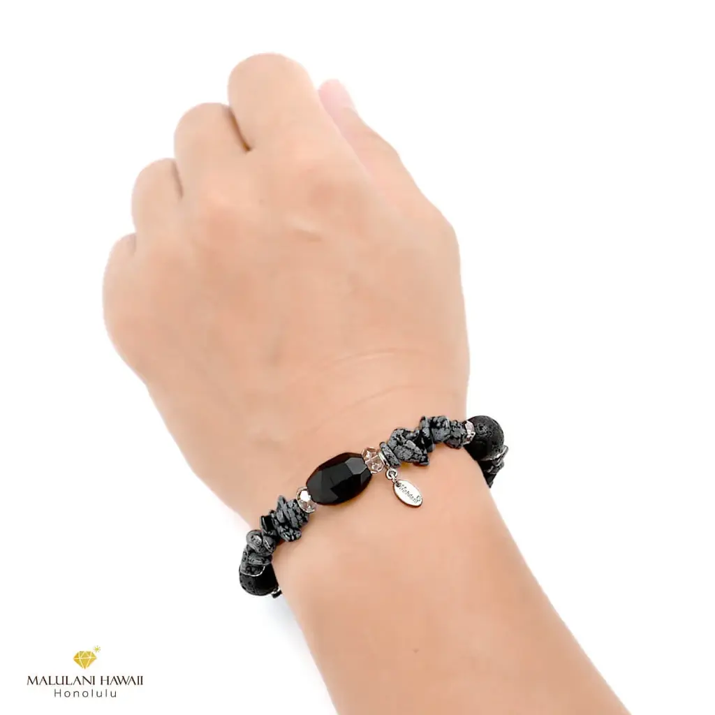 静けさと力強さを併せ持つブラック系のブレスレットです。グラウンディング(地に足をつける力)の強化に寄与するとされ、直観力や行動力を高める働きが期待されます。