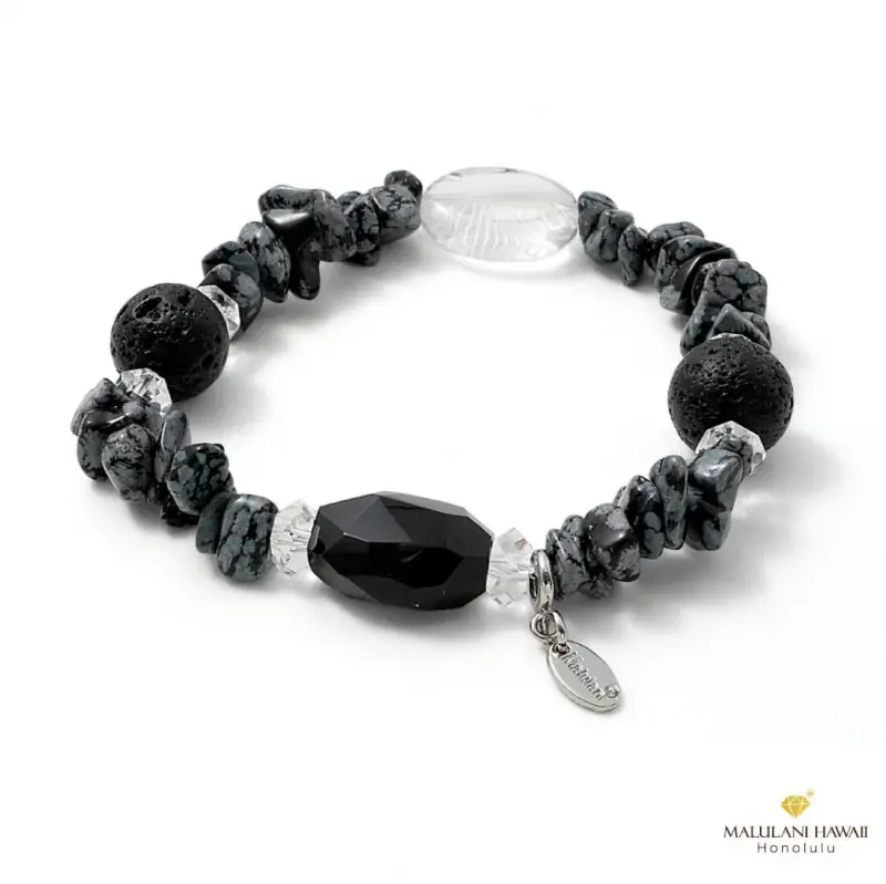 スノーフレークやラバストーンなど、表情が豊かな石が配され、見た目はシンプルながらおしゃれなポイントにもなります。厄除けや仕事運のお守りとしての用途が想定されています。