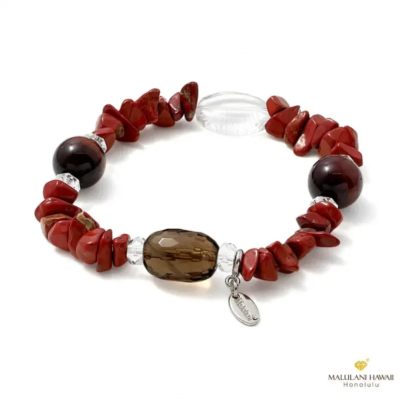 情熱と安定感を併せ持つ配色のブレスレットです。第一チャクラの活性化を促す石が中心に配され、健康運向上や仕事運、金運向上、邪気払いに適しているとされます。