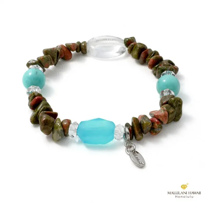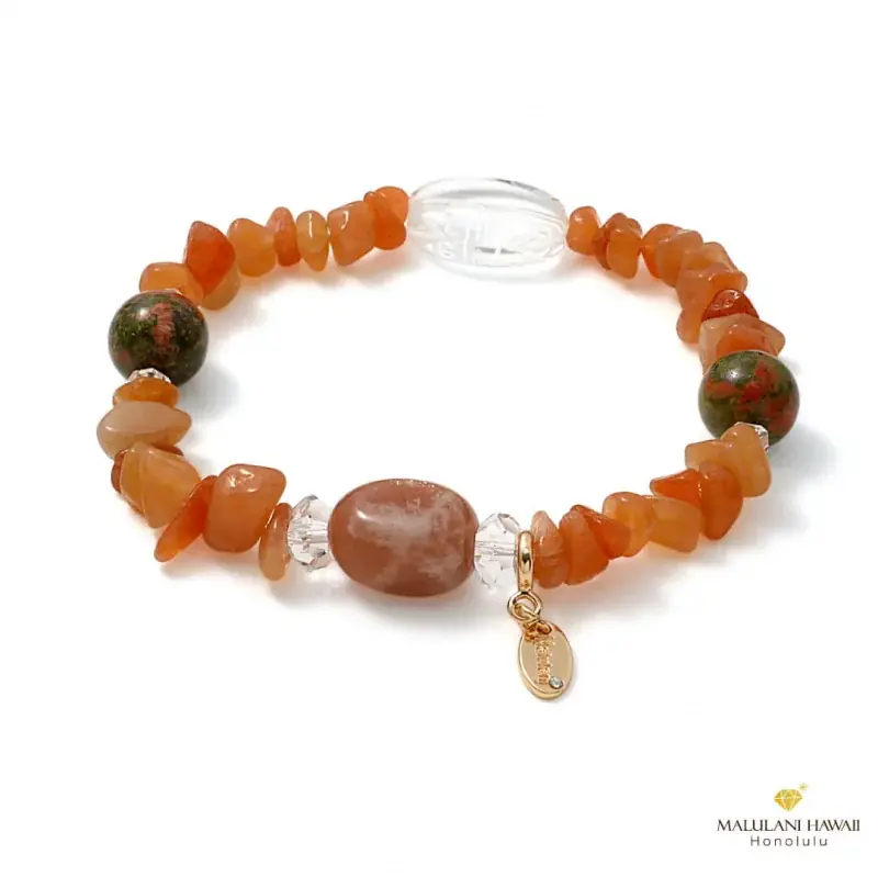 太陽や地球のエネルギーを宿す石を用いた、再生と癒しを意図するブレスレットです。疲れた心身を温かく包み、生命力を呼び覚ますという狙いがあります。