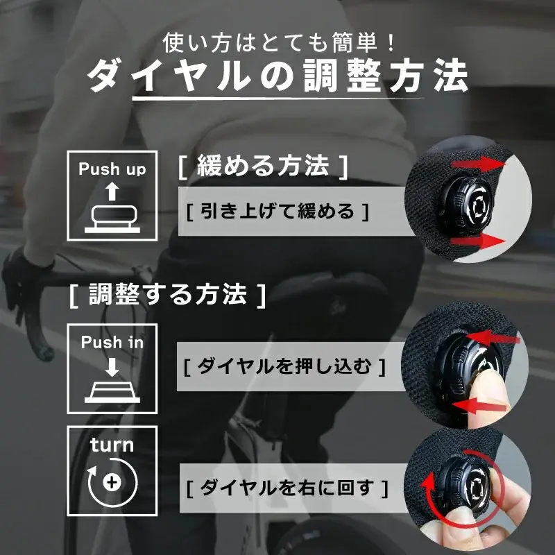 裏面は高摩擦ノンスリップドット加工が施され、走行時のズレを抑制する構造になっています。固定方式は被せ式に加えワイヤーダイヤル固定を装備しており、装着後の安定感を高める工夫がなされています。