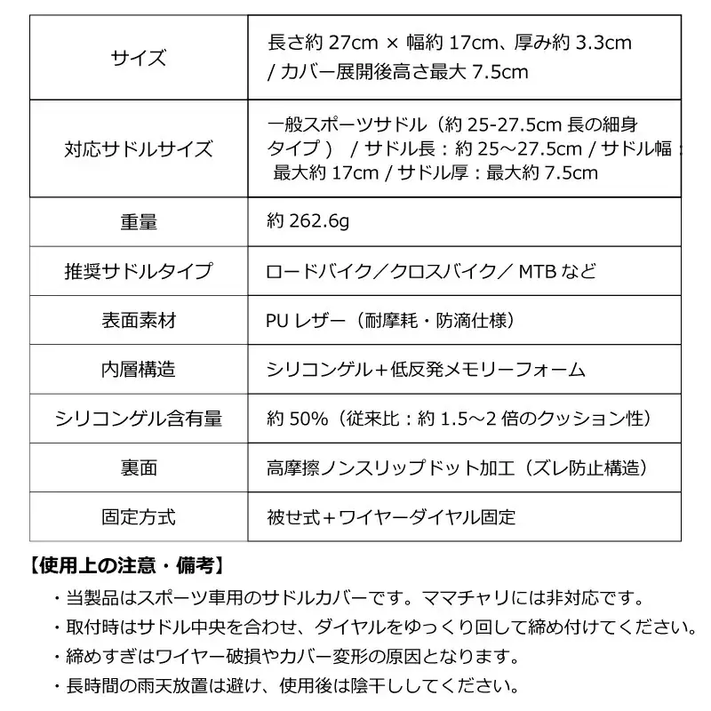 ロードバイク・クロスバイク・MTBなどの一般的なスポーツサドル向け。サドル長約25~27.5cm、幅最大17cm、厚み最大7.5cmまで対応。ママチャリなど幅広サドルは不可です。