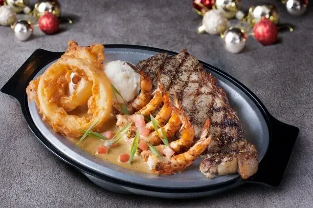 「ニューオリンズ風ステーキ&シュリンプ」は280gのサーロインステーキとグリルドシュリンプを組み合わせたサーフ&ターフです。ルイジアナ州ニューオリンズ風のケイジャンスパイスを効かせたソースで提供されます。