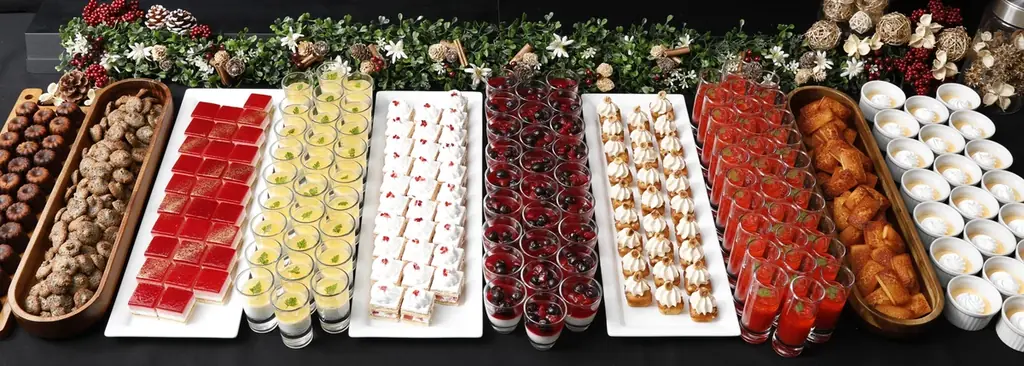 季節のデザートは主にグラスデザートやムース、焼き菓子など多彩なラインナップです。定番の焼き菓子とプリンも含め、合計10種類がデザートビュッフェに並びます。