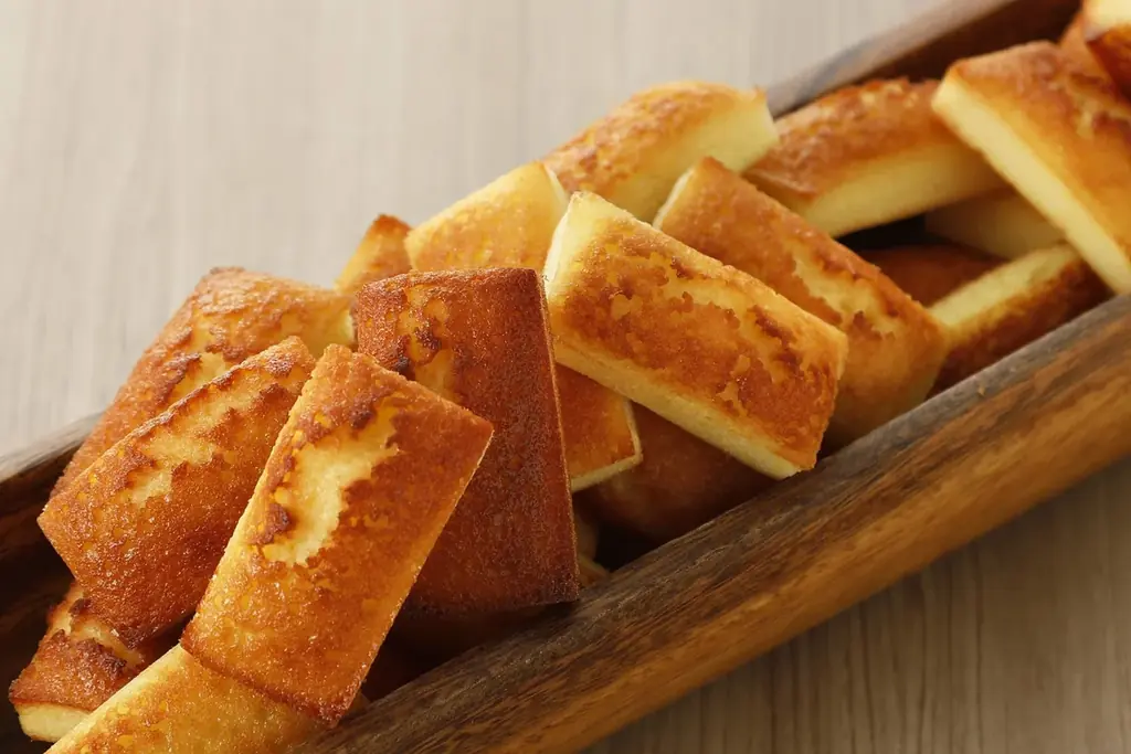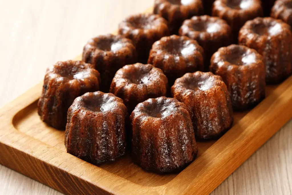 - カヌレ:バニラ、レモン、ラム酒を馴染ませたミルクと卵のアパレイユをじっくり焼き上げた焼き菓子。