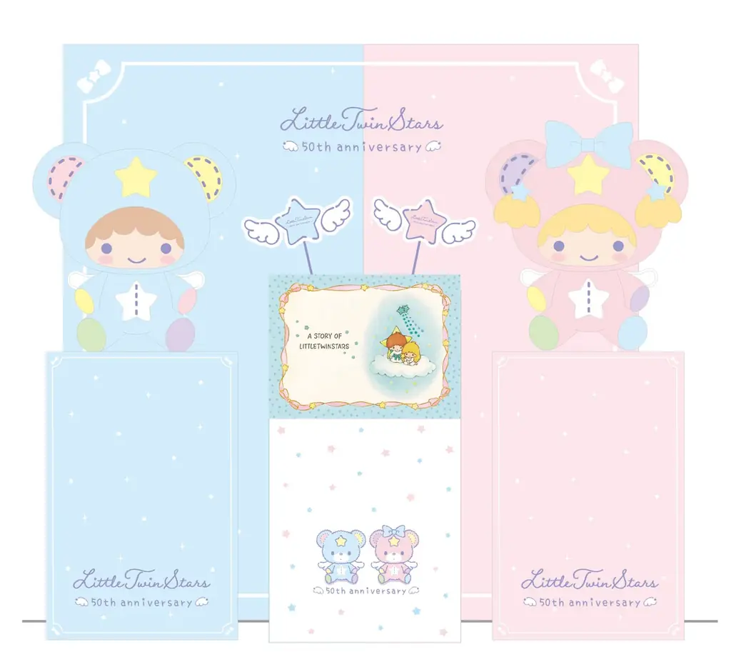 - 購入特典1:「リトルツインスターズ50周年ステッカー」をお買い上げの方に1枚プレゼント(全国のサンリオショップ・百貨店サンリオコーナー・サンリオオンラインショップ対象)。