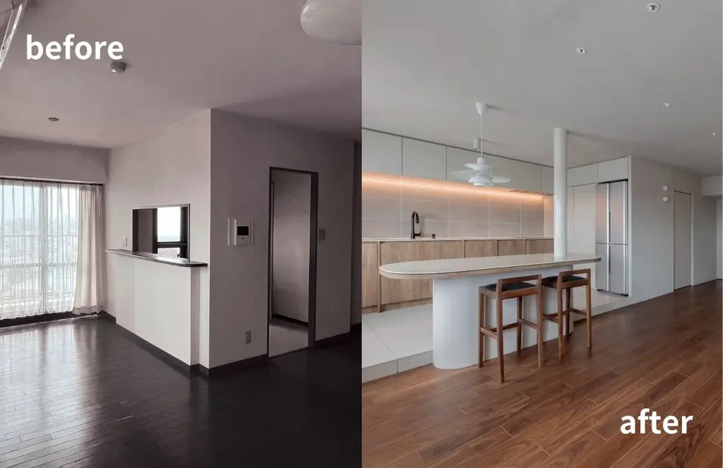 本物件は、28年経過したマンションを対象に、約2,030万円(2025年施工)を投じて行われたフルリノベーション案件です。打ち合わせ期間は約3か月、工事期間も約3か月というスケジュールで、施工後の間取りは【before】3LDKから【after】2LDKへと変更されています。