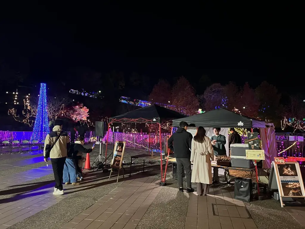 ロゴスランドではイルミネーションを見るだけでなく、身体の芯から温まる食事や、たき火を介した体験プログラムが用意されています。ディナータイムの特別演出や屋台での販売など、夜の時間帯をゆったり過ごせる工夫が施されています。