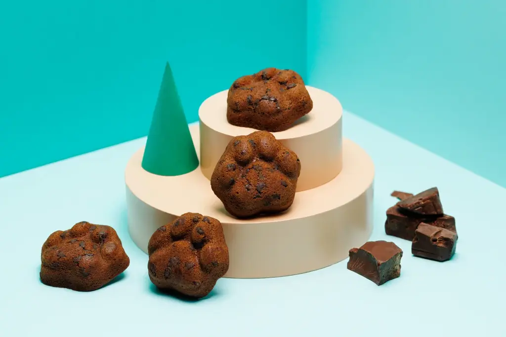 新作のコクウマショコラフィナンシェは、KOKUNEKOの定番である肉球型フィナンシェをベースに、初めてショコラフレーバーを取り入れた期間限定商品です。ショコラの風味をしっかりと感じさせるために、スペイン製のチョコレート(カカオ分66%)とカカオ分44%のチョコチップを生地に練り込んで焼き上げています。
