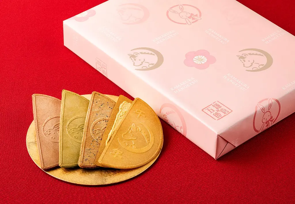 鎌倉五郎本店が2012年から続ける「干支半月」シリーズは毎年人気を博し、完売が続出する定番企画です。2026年の干支である「午(うま)」をモチーフにした『午年半月』は、馬の絵柄をあしらったゴーフレットに栗と芋の風味を活かしたクリームを挟んだ、栗きんとん風味の新春限定スイーツです。