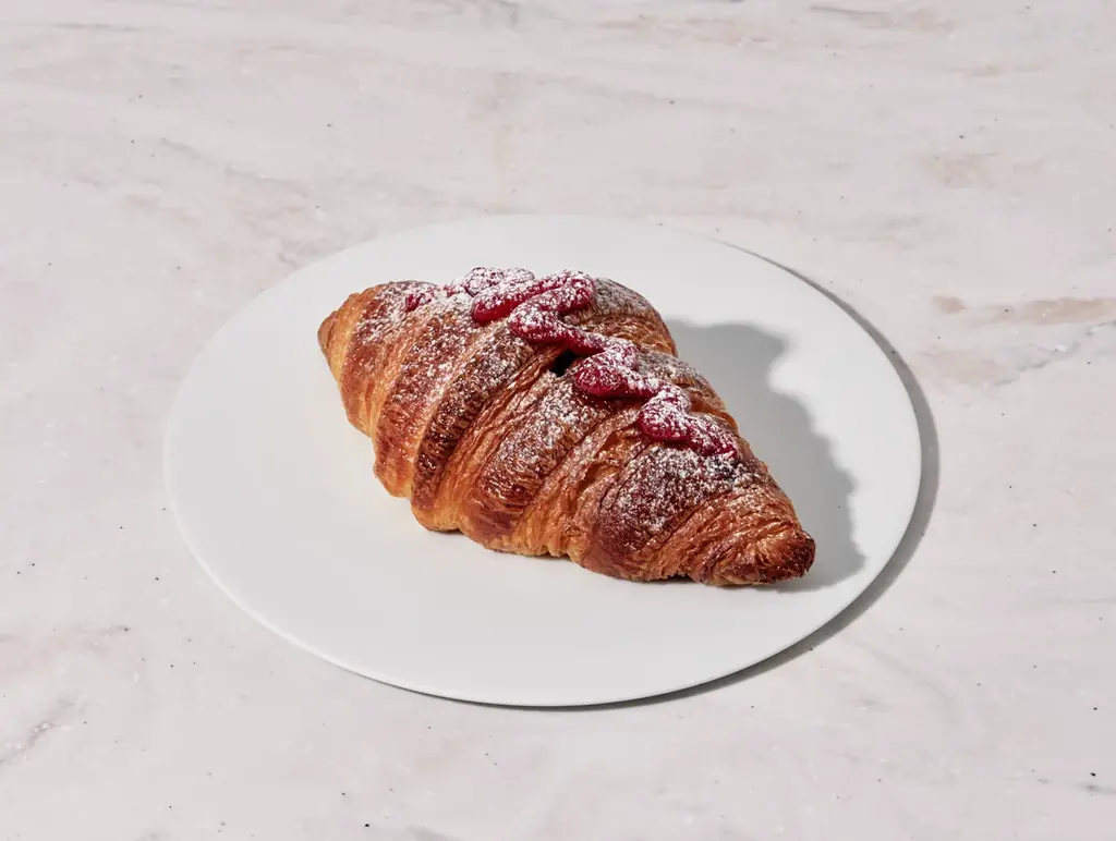 商品説明:風味豊かな発酵バターを生地に織り込み、表面はザクザクとした歯ごたえ、中はエアリーな食感を残すコルネッティ。中には滑らかなチョコレートクリームを絞り、天面にプリンチ®製のラズベリージャムをトッピングしている。ラズベリージャムはチョコレートクリームと合わせたときに甘すぎないように炊き上げられている。