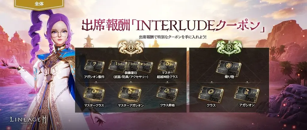 - オリジン ワールド:INTERLUDEクーポン:装備復旧(武器/防具/アクセサリー)(1日目)、INTERLUDEクーポン:クラス昇格(4日目)、INTERLUDEマスター クーポン:アガシオン(7日目)、INTERLUDEクーポン:コンテンツ アガシオン製作(10日目)、INTERLUDEマスター クーポン:クラス(12日目)、INTERLUDEマスター クーポン:超越神話級クラス(14日目)