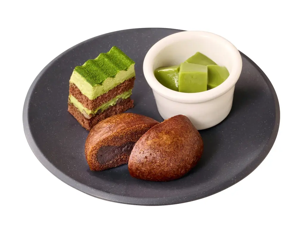 | 和心贅沢盛り皿 | 590円 | 菓子皿とお抹茶のセット:800円。抹茶ケーキに洋酒を使用。 |