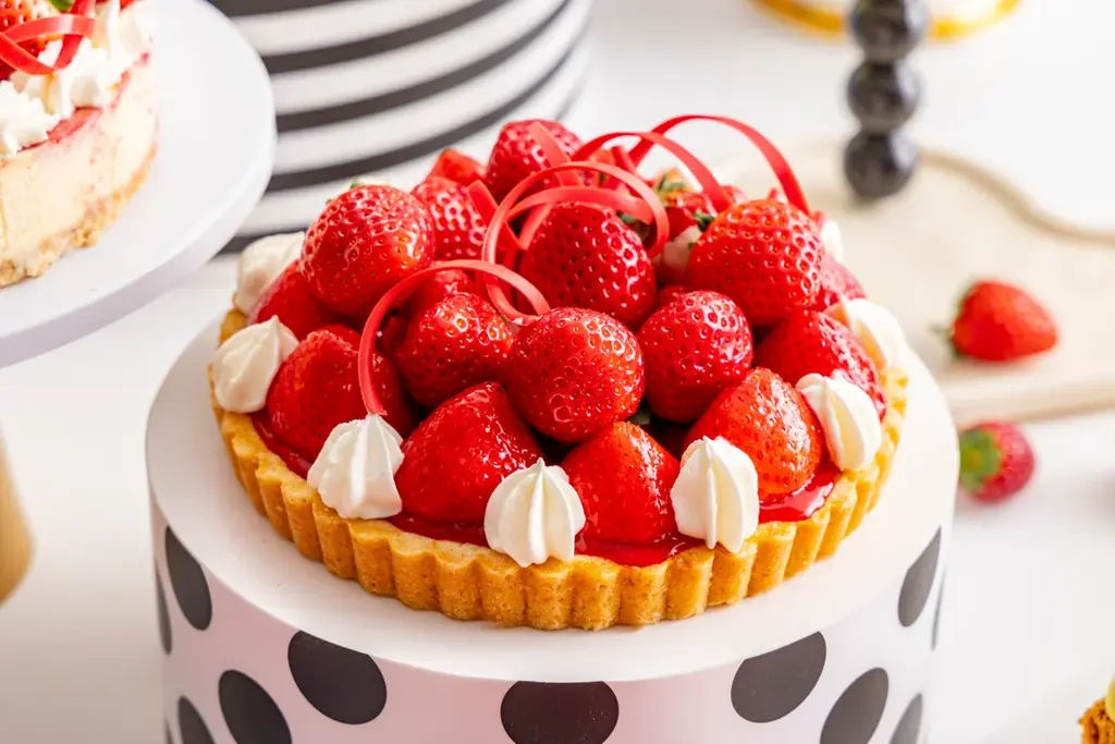 • 王道苺タルト:アーモンドタルト生地にライムとレモンのクリームを重ね、大粒の艶のある苺を贅沢にトッピング。ディプロマットクリーム(カスタードと生クリームの合わせ)で甘酸のバランスを整える。