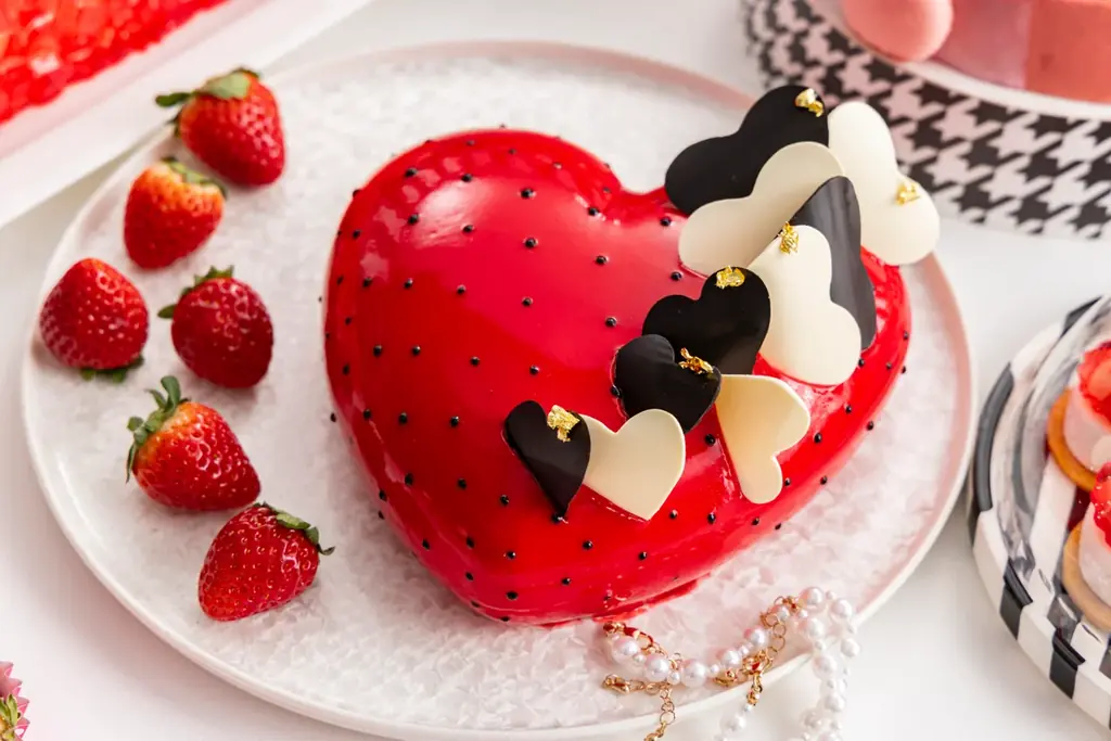 • アジョリーハート:ルビーチョコレートムースにストロベリー、ライチ、ラズベリーのクリームとライチのコンポートを内包したハートシェイプ。