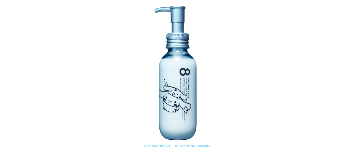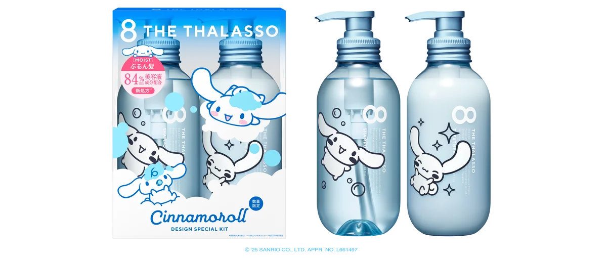 今回のコラボは、世代を超えて愛される「シナモロール」の愛らしいビジュアルを、エイトザタラソ製品のパッケージに採用した数量限定のスペシャルデザイン。泡やシャボン玉、きらめきに包まれたシナモロールの表情が配され、日常のヘアケアをより楽しくする意匠となっています。