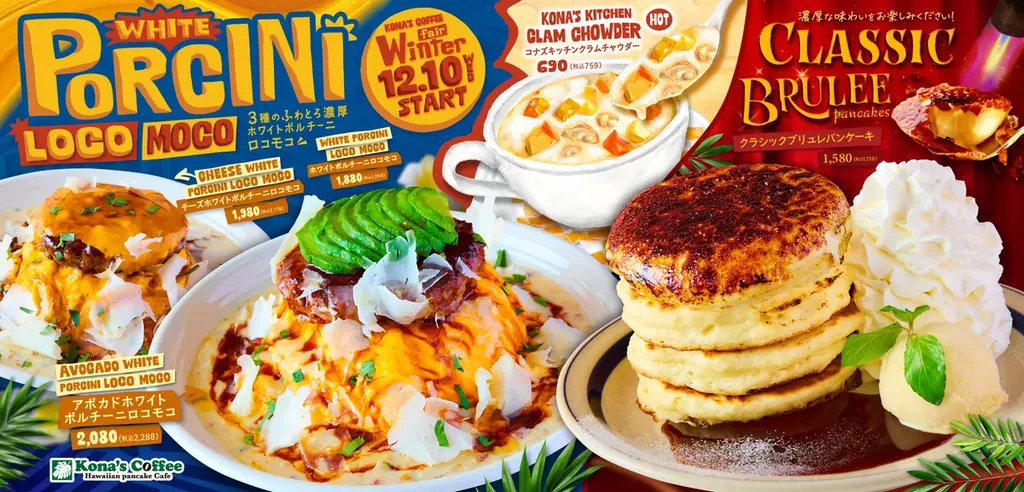 ハワイアンカフェ・レストラン「コナズ珈琲」(株式会社KONA’S、代表取締役社長:阿部 和剛)は、2025年12月10日(水)より冬季限定メニューを全国の店舗で順次発売します。今回のラインナップは、スイーツの「クラシックブリュレパンケーキ」や、冬らしい濃厚さを打ち出した「チーズホワイトポルチーニロコモコ」など、合計5品で構成されています。販売期間は2025年12月10日(水)〜2026年1月25日(日)です。