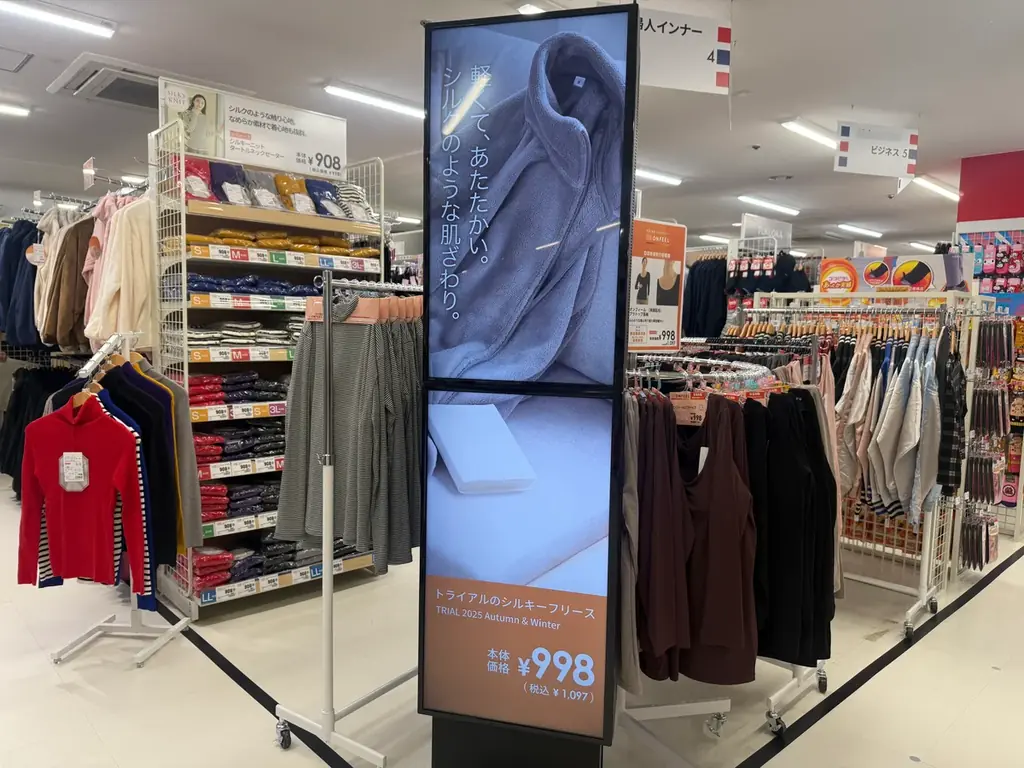 2階売場では衣料のオリジナルブランドも充実しており、発熱・保温・保湿機能を持つインナー「ONFEEL」は累計販売数600万枚(2025年3月時点)を突破しています。代表的な商品の一つ「シルキーフリース」は保温性約60.1%(JIS L 1096 A法)を実現しています。