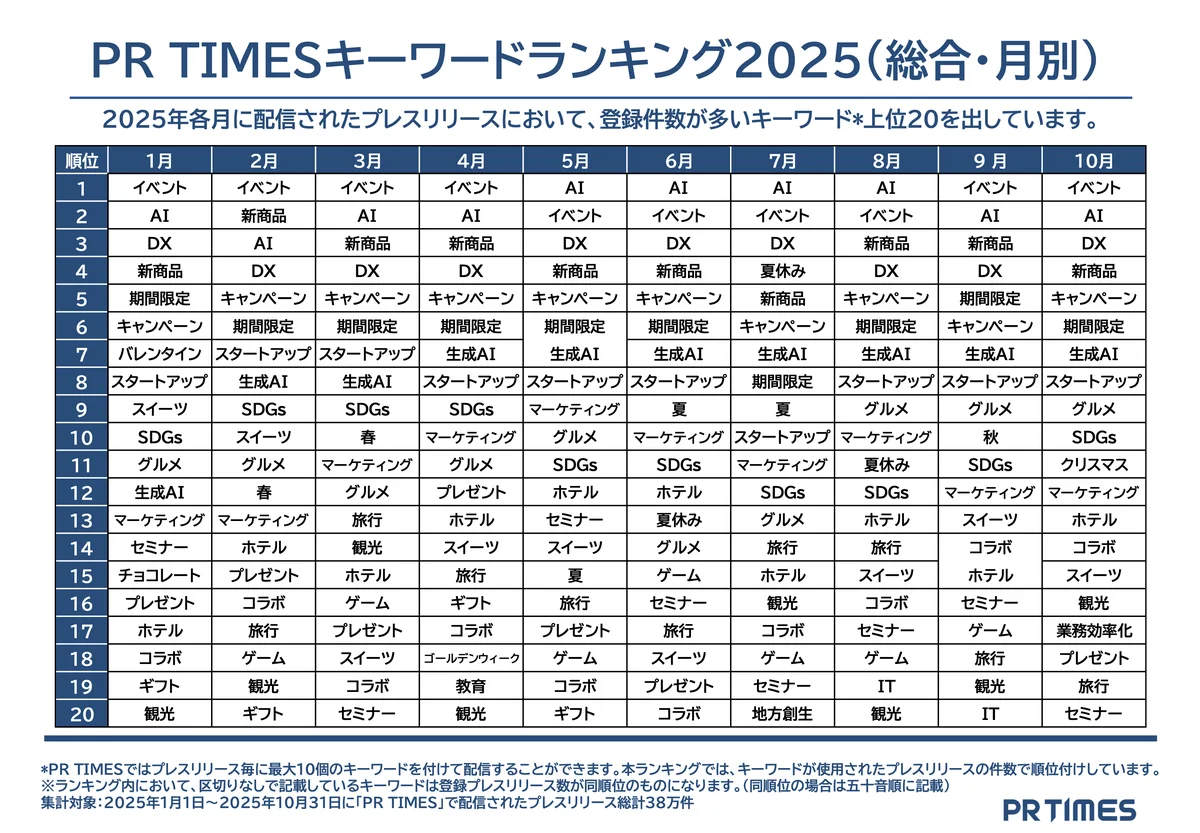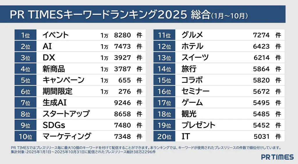 株式会社PR TIMESは2025年11月28日に、同社が運営するプレスリリース配信サービス「PR TIMES」に掲載された、2025年1月1日〜2025年10月31日の期間に企業から発表されたプレスリリース38万2296件を対象にしたデータ分析結果を公表しました。対象期間に登録されたキーワード総数は46万7010種にのぼり、件数の増減や月別の推移、キーワードごとの発表内容の分析を通じて、2025年の企業活動の潮流と変化を読み解いています。