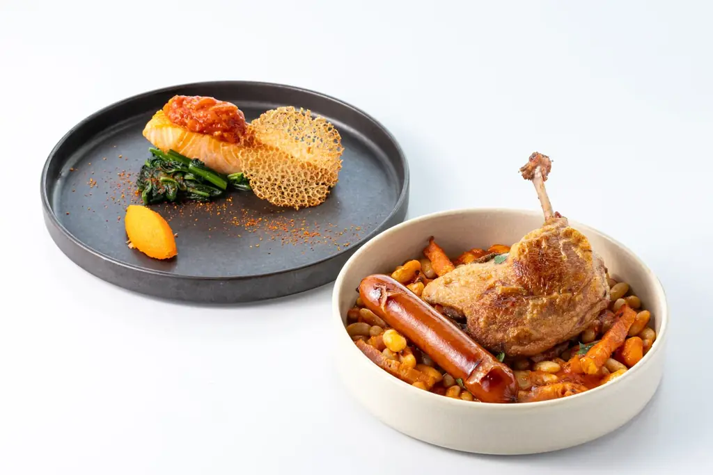 | 選べるメイン | カスレ(鴨のモモ、白インゲン等をトマトベースで煮込む)またはサーモンピペラード(低温調理サーモンと赤パプリカ・トマトのソース) |