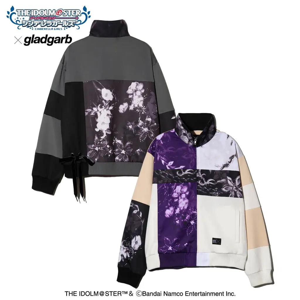 『サイハテに咲く鏡花』の衣装デザインをモチーフに、トラックジャケットにリリカルなムードを持たせた一着です。gladgarbらしい水彩画タッチでドレスの花々を描き、構築的なパッチワークでアシンメトリーなヴィジュアルを表現しています。
