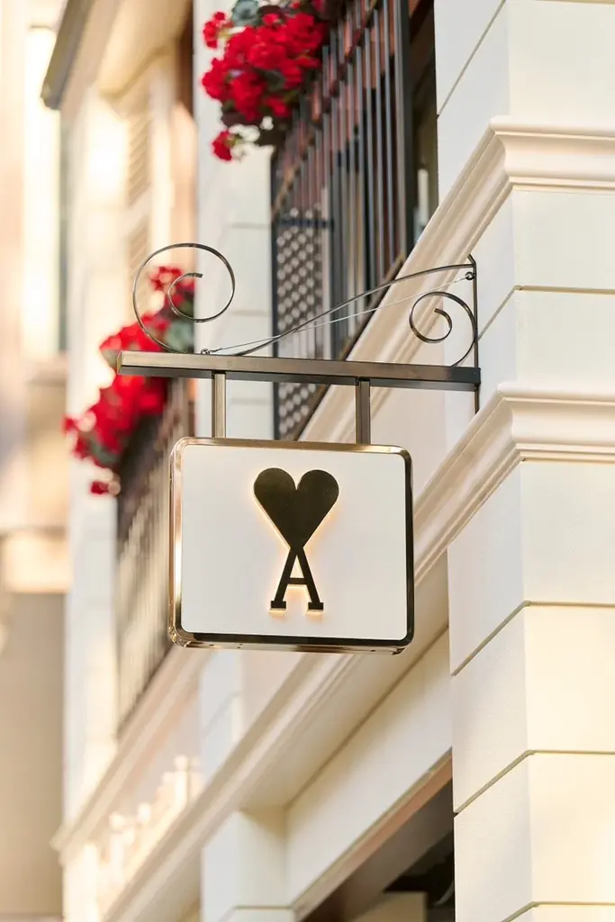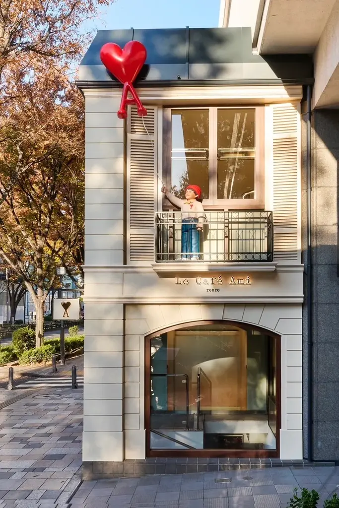ファサード中央には、創設者兼クリエイティブディレクターのアレクサンドル・マテュッシの幼少期の着想から生まれた“小さな男の子”のオブジェが据えられ、赤いAmi de Cœur(アミ ドゥ クール)のバルーンを手にしています。これはアルベール・ラモリス監督の短編映画『赤い風船(Le Ballon Rouge)』へのオマージュであり、ブランドが大切にする詩的な世界観を象徴しています。