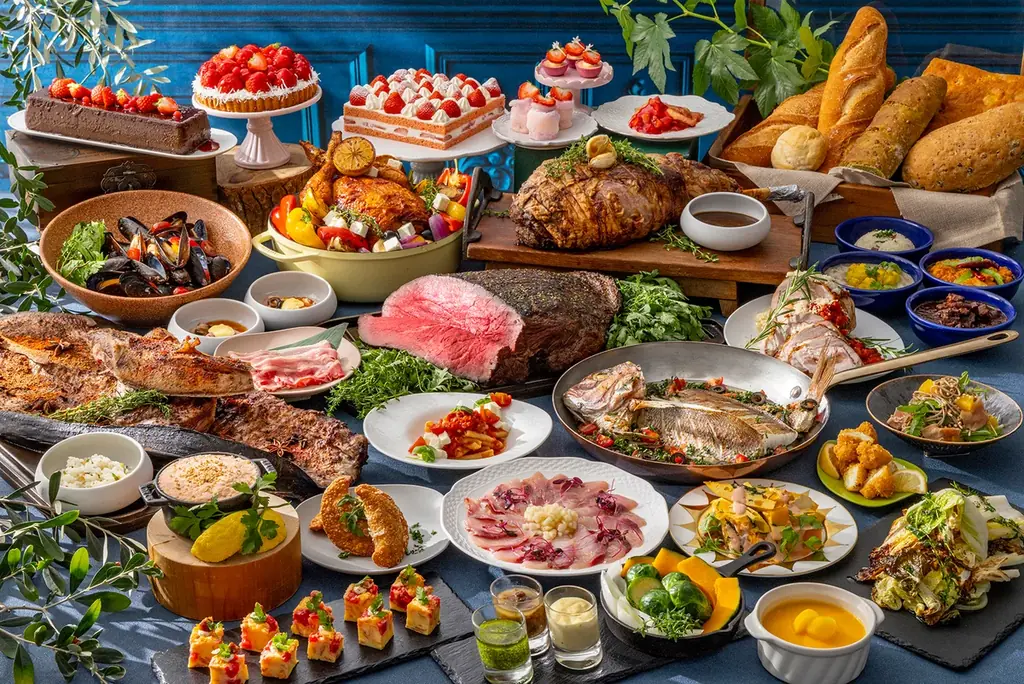 ビュッフェはホットメニュー、コールドメニュー、スイーツ、そして年末年始限定のシーフードバーなどで構成されます。メニューは日替わり・週替わりの要素を含み、週末限定や土日祝限定の提供メニューも設けられています。