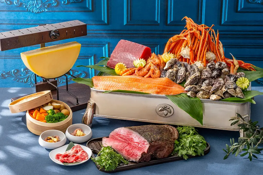年末年始の「シーフードバー」では、ズワイガニ、マグロ、サーモン、エビの4種類を食べ放題で提供します。加えて牡蠣剥き職人(オイスターシャッカー)による目の前での仕上げが行われ、新鮮な牡蠣を3個セットで提供します。さらに、年末年始限定の「ラクレットチーズ 蒸し野菜添え」も加わります。