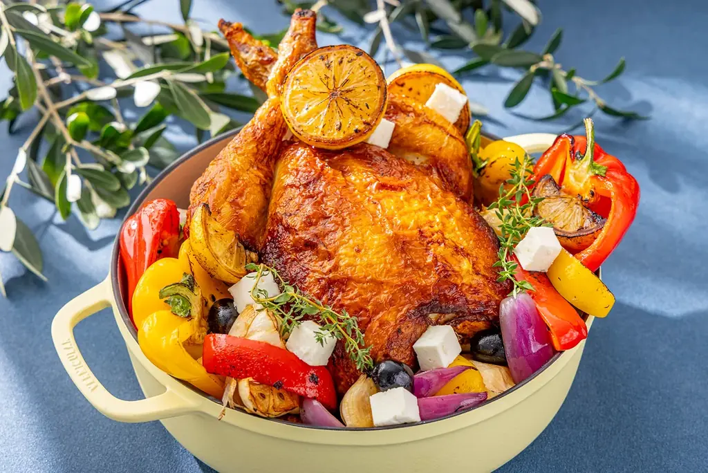 - グリークチキン ガーリックレモンマリネ(丸ごとの鶏をレモンとガーリックでマリネ、フェタチーズやオリーブ添え)