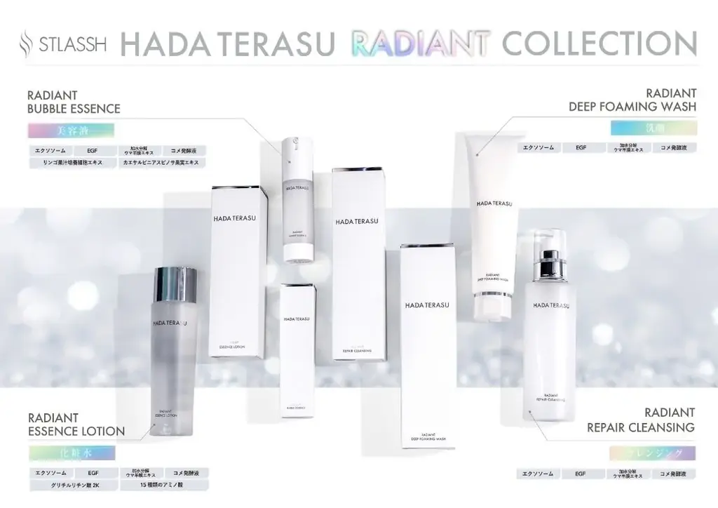 「RADIANT(ラディアント)」シリーズはHADA TERASUの新ラインで、「光り輝く透輝肌」を目指して開発されました。シリーズはヒト由来の幹細胞培養液やEGF、加水分解ウマ羊膜エキス(*²)やエクソソームといった保湿成分を配合し、角層までの保湿を重視しています。