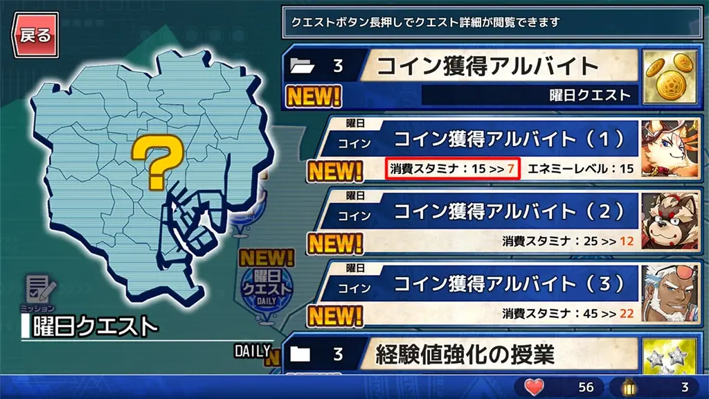 スタミナ関連キャンペーン メインクエスト消費スタミナ0、フリー・曜日クエスト消費スタミナ1/2 11/28 20:00〜12/05 13:59(予定)