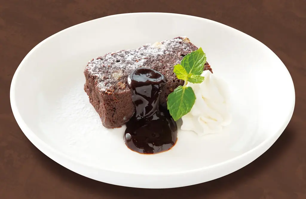 濃厚ホットチョコレートケーキは、程よい甘さと香ばしいクルミがアクセントのあたたかいデザートで、寒い季節に合わせた冬季限定商品です。
