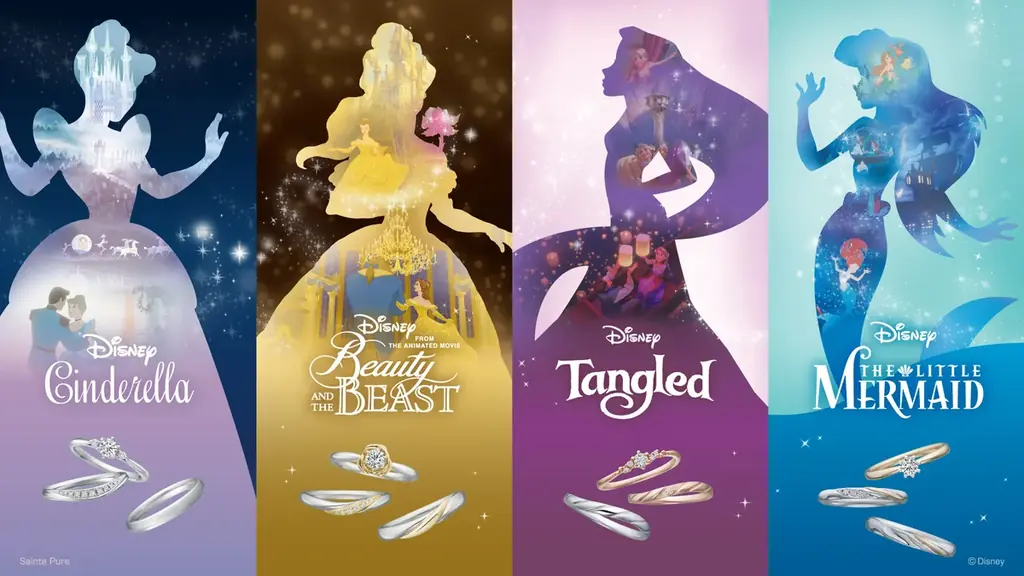 - シャイニーゴールドとプラチナの2色を用い、地上と海底の世界を表現したコレクション。アリエルの心のときめきを表現したデザインで、成約時にはシルバープチペンダントが提供されます。