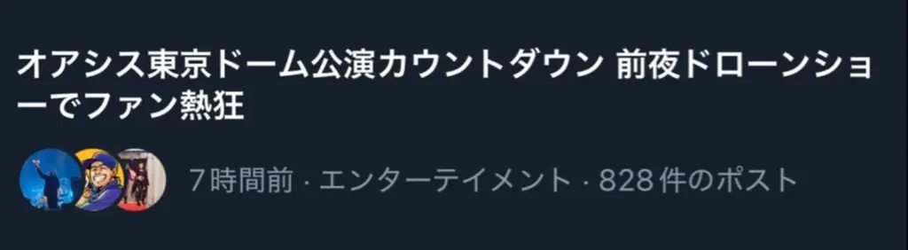 | SNS反響 | Xのトレンドに「オアシス東京ドームカウントダウン 前夜ドローンショーでファン熱狂」として掲載(2025年10月24日 午後8時時点のXトレンド欄から引用) |