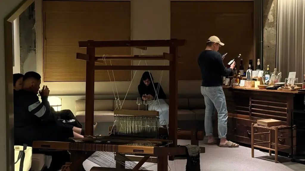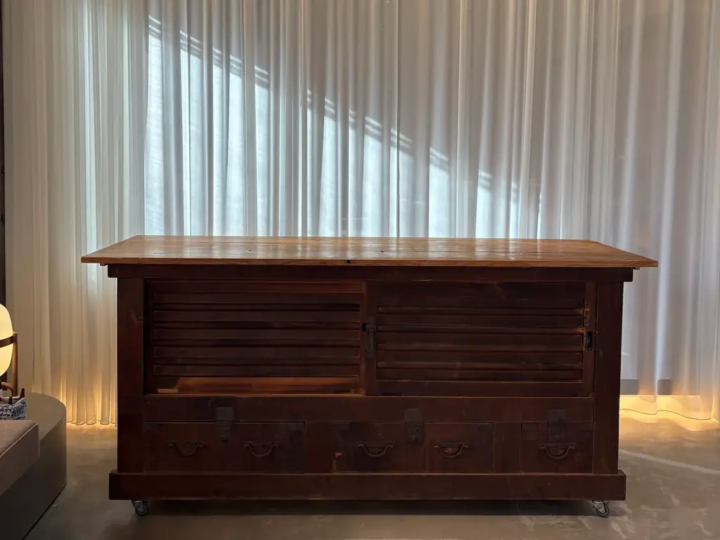 このカウンターは丹後地域の歴史を映す存在であり、空間の象徴として設えられています。古い家具が新しい用途で使われることで、地域の歴史と現代の滞在体験が接続される意図が明確です。