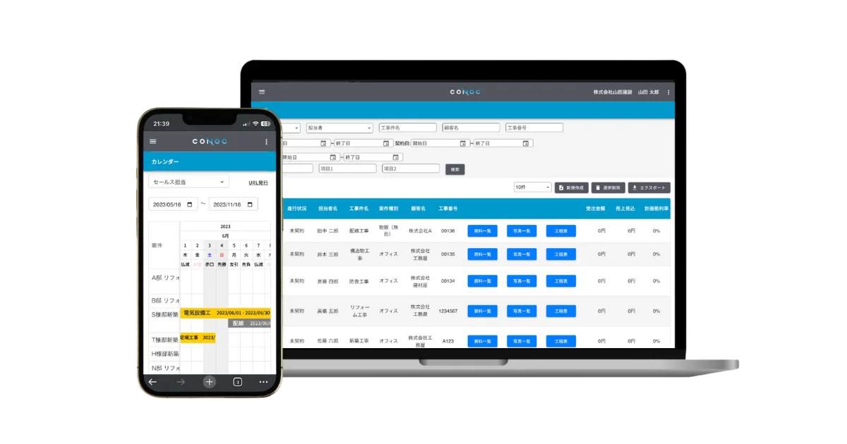 CONOC建設業クラウドは見積や請求書の作成、売上や原価の自動グラフ化、工程表の作成など、建設業務を一元管理する機能を備えています。直感的な操作性とシンプルなデザインを採用し、導入のハードルを下げることを目指しています。