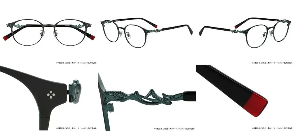 首元の捕縛布がフロントにまで掛かるイメージをメタルパーツで表現。フレームは相澤のコスチュームカラーの黒を採用し、左テンプルエンドに赤のワンポイントを配して“個性”発動時の目の赤さをモチーフにしています。
