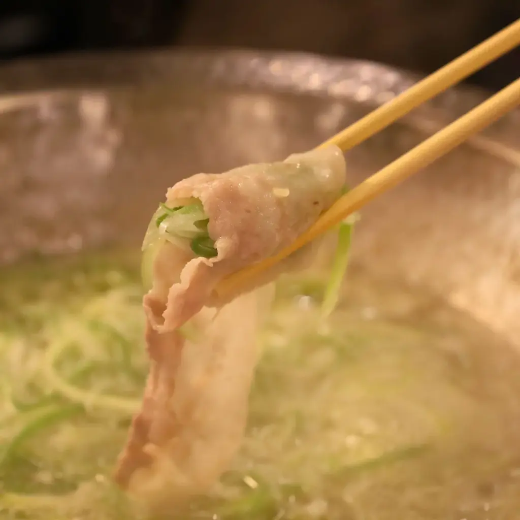 | 食べ方のポイント | ネギを鍋中心に入れる→肉を匠だしに5秒浸してひっくり返す→ネギを巻いて一口で食べる(ネギ巻きしゃぶ) |