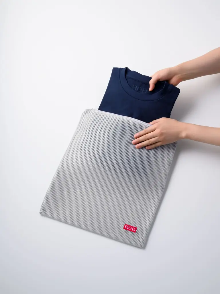 キャンペーンで提供されるオリジナルランドリーメッシュポーチは、日常のお手入れで使いやすい仕様に設計されています。色はグレーで、洗濯物をまとめておく際や洗濯機での使用に適したメッシュ素材が採用されています。