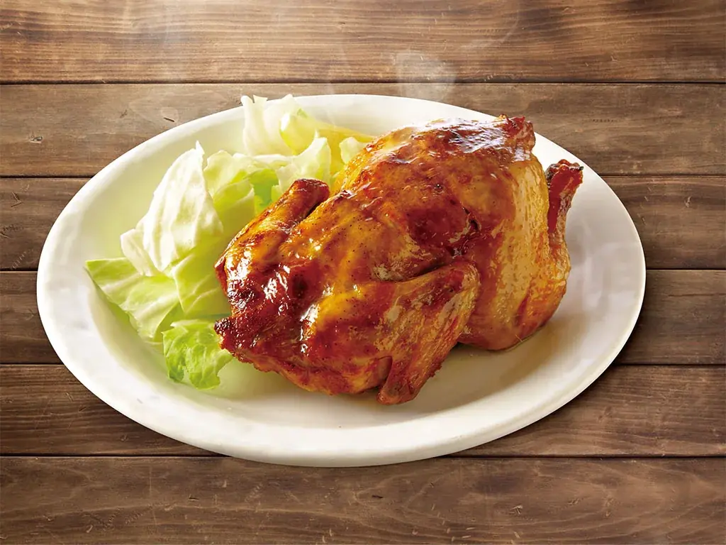 ロティサリーチキンは一昼夜かけてスパイスたっぷりの特製ダレに漬け込み、低温で回転させながら余分な脂を落とす工程で焼き上げられます。こうした調理法により、皮の香ばしさと内部のしっとり感を両立させています。